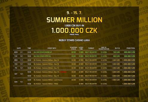Po dvojici side eventů - pondělní 700 Kč Big Stack Warm Up byl na Lukách zakončen three-way dealem mezi Jiřím Matějkou, Robertem Gulášem a Fredericem Rorizem a úterní 900 Kč Big Stack Special po five-way dealu opanoval Michal Jenis - došlo i na turnaj hlavní. Léty prověřené pobočka Rebuy Stars na pražských Lukách od středy hostí Main Event Summer Million a parametry turnaje jsou průzračně jasné: do soubojů o prizepool v hodnotě 1.000.000 Kč se zapojíte po zaplacení buy-inu 1.000 Kč. K překonání avizovaného milionu je tedy třeba tisícovka registrací, té se ale během doposud odehraných flightů dosáhnout nepodařilo.