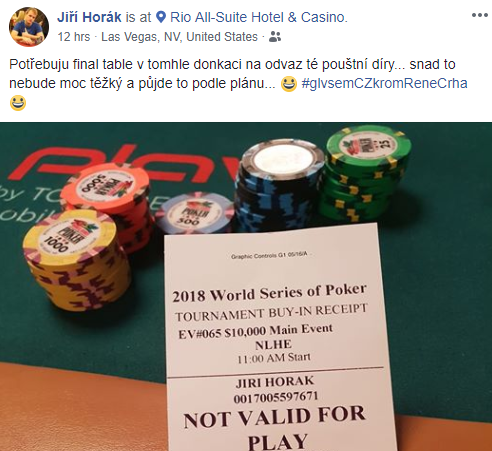 V Kalifornii žijící Čechoameričan si zabalil 70.800 v žetonech a dnes v jedenáct hodin dopoledne lasvegaského času se usadí k 118 velkým blindům. Good luck, nechť se Oldřich těší takové formě, která jej v letech 2014 a 2017 donesla až na 97. a 38. příčky masivních $1.500 Monster Stacků.