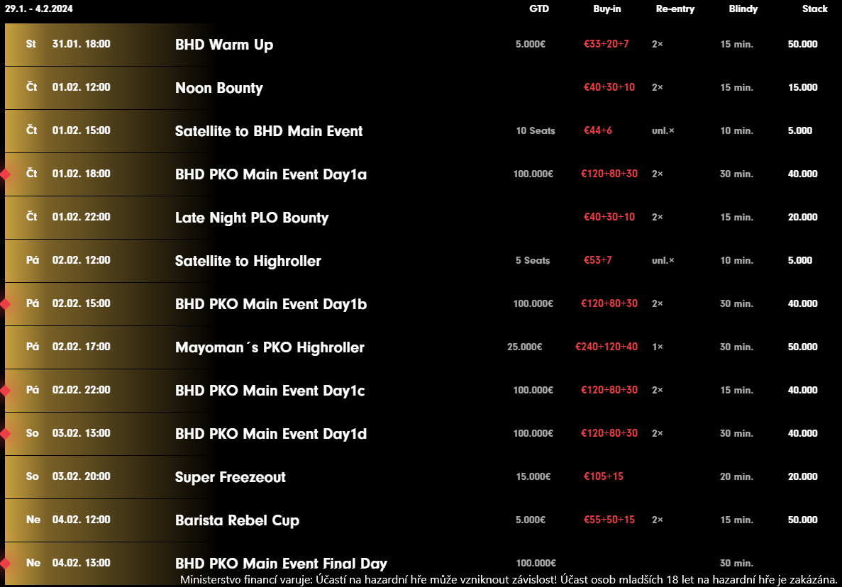 Mezi turnaji naleznete Main Event, ve kterém se bude hrát o €100.000 a první hrací den startuje už ve čtvrtek. Nadále nechybí Highroller o €25.000 za vstupné €380 a pouze jedním re-entry či naopak kvalifikace v podobě menších rychlejších turnajů. Stejně tak zde naleznete formát Freezout a ve středu nebude chybět Warm Up. Na své si přijdou i příznivci Omahy. V neděli od 13:00 pak poběží finální hrací den Main Eventu.