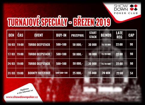 Na turnajové speciály se v Showdownu můžeš těšit všechny neděle. Vždy začínáme v 19:00 hodin s pozdní registrací do 22:00 a samozřejmostí jsou i dvě re-entry v každém z těchto turnajů. A to není vše. Na všech pátečních a nedělních turnajích hráči sbírají body do leaderboardu, přičemž nejlepší hráči pak obdrží vouchery do cash game v minimální hodnotě 1.000 Kč a na vítěze a druhého v pořadí pak čeká voucher v hodnotě 3.000 resp. 2.000 Kč. Chybět samozřejmě nebude ani tradiční Forbes Pokerman Tour Kilčo, které se uskuteční ve čtvrtek 21. března.