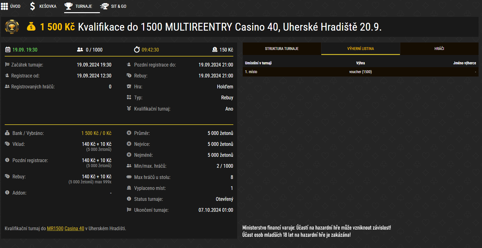 Parametry pokerového turnaje "1500 Multi - 100 000 Kč GTD"