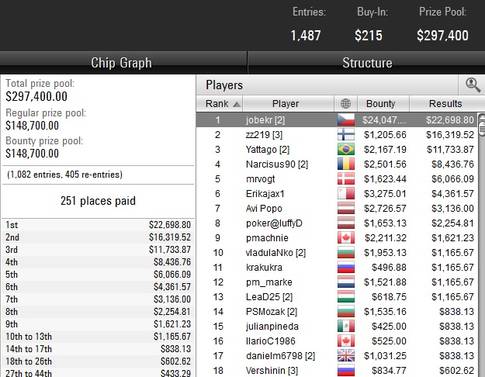 To samé lze říci také o turnajové bilanci zkušeného Josefa „jobekr" Šnejberga, jehož směrem dnes po zkompletování Bounty Builder $215 s garancí $200.000 zamířila tučná finanční odměna ve výši $46.746. Odměna to navíc byla vítězná, neboť hodinu po půlnoci náš zástupce překonal i posledního z 1.082 soupeřů, k nimž je navíc třeba připočíst ještě 405 vstupů, jež byly zaplaceny formou re-entry. Z tařka $300tisícového prize poolu si jobekr ukrojil ten zdaleka největší podíl - kupříkladu jeho soupeř z heads-upu si na své konto připsal „pouze" přibližně $17.500.