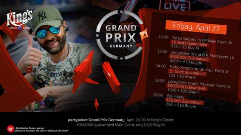 Jeho vedení si s partypokerem tuze rozumí a výsledkem již bylo spolupořádaní několika atraktivních turnajových festivalů, které budou podle všeho do Česka v hojném počtu proudit i v budoucnu. A jeden takový můžeme sledovat právě v těchto dnech. Konkrétně v termínu od 26. do 30. dubna, kdy se v největším evropském poker roomu uskuteční další vydání partypoker Grand Prix, jejíž Main Event nese při buy-inu €220 garanci ve výši €500.000.