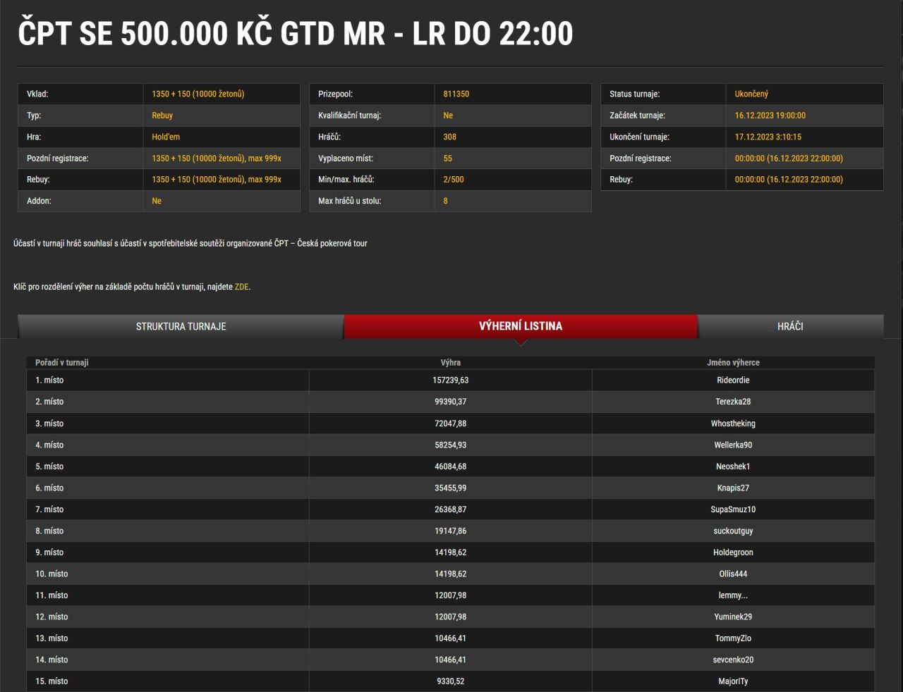 Nakonec vítězství odnesl hráč s přezdívkou "Rideordie," který získal úžasnou odměnu ve výši 157.239 Kč. Na druhém místě skončila hráčka "Terezka28" s odměnou 99.390 Kč, zatímco třetí místo obsadil hráč "Whostheking" s odměnou 72.047 Kč, o kterém z našich ČPT reportů nečtete poprvé.