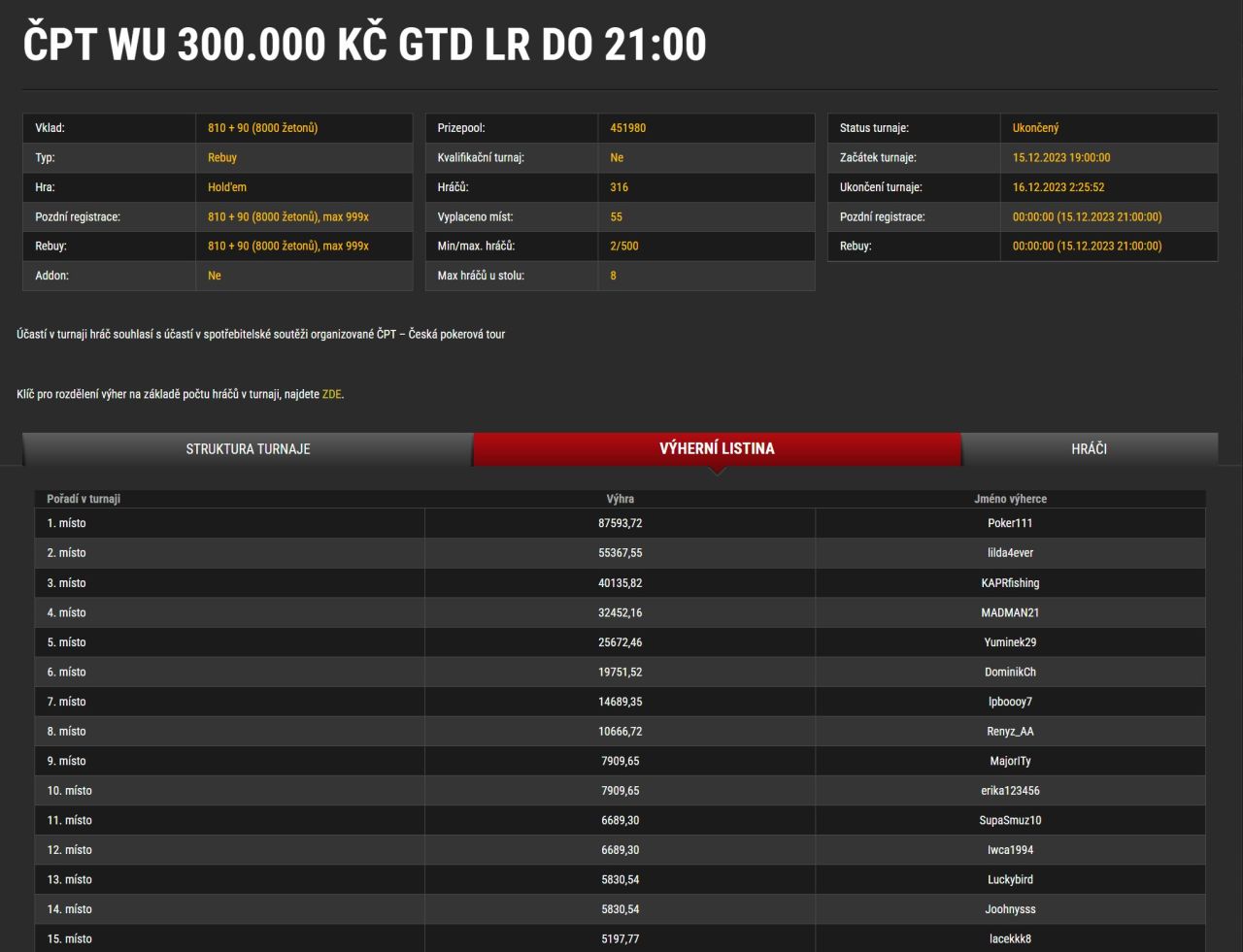 Turnaj začínal v 7 hodin večer a hrál se do půl 3 do rána. Tenhleten maraton nejlépe zaběhl hráč pod přezdívkou „Poker111“, který porazil široké pole hráčů končíc na příčce číslo 1. Za to si sypl do šrajtofle slušných 87.593 Kč.