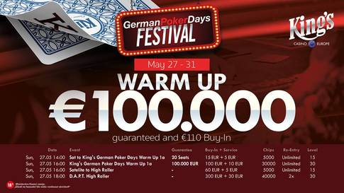 Třebaže je zbylý průběh DAPT již pouze pro vyvolené, nedostatkem turnajové akce žádný návštěvník největšího evropského poker roomu rozhodně v nadcházejících dnech trpět nebude. A když mluvíme o nadcházejících dnech, myslíme tím také dnešek. Už v 16:00 hodin se zde totiž rozehraje startovní den 1a King's German Poker Days Warm Up eventu s dostupným buy-inem €110 a atraktivní garancí ve výši €100.000. O dvě hodiny dříve se navíc můžete zapojit do 20eurového satelitu s garancí nejméně 20 lístků. A ve 20:00 hodin je pro hráče připraven 888 DAPT Sunday Blast s buy-inem €88, v němž se bude hrát o nejméně, tušíte správně, €8.888.