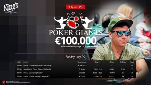 Neděle je v King's společně s vyvrcholením Main Eventu vyhrazena také Poker Giants Highroller eventu s buy-inem €330 a garancí €10.000. Startovní stack tohoto turnaje je nastaven na 100.000 v žetonech, levely jsou 30minutové a hráči mohou využít až dvě re-entry. Hrát se začne v 17:00 hodin.
