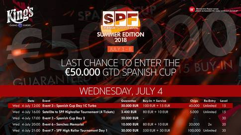 Společně s finálovým dnem SPF Spanish Cup se dnes v útrobách King's chystají ještě další tři turnaje. V 16:00 hodin vypukne satelit s buy-inem €90, v němž budou k mání nejméně 4 lístky do večerního SPF High Rolleru. Ten je na programu od 21:00 hodin a při buy-inu €600 nabídne možnost utkat se o podíly z €30.000. Úderem osmé hodiny večerní přijde na řadu Sanchez Memorial s buy-inem €90 a garancí €10.000.