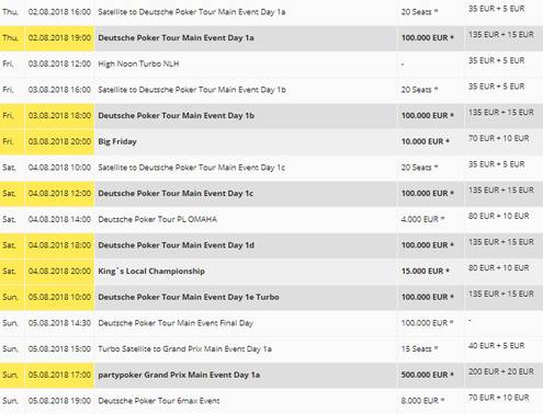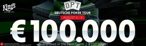 Srpnový Deutsche Poker Tour Main Event se odehraje v termínu od 2. do 5. srpna. Buy-in je nastaven na €150 a v prizepoolu již nyní leží velmi líbivých garantovaných €100.000.