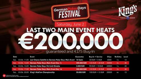 Dnešek nabídne hned dva side eventy, od 15:00 budou mít dealeři plné ruce práce s rozdáváním čtyř karet účastníkům €100 GPD Pot Limit Omaha s garancí €5.000. Ve 20:00 pak odstartuje jednodenní €115 King's Hold'em Championship, v jehož prizepoolu již nyní leží garantovaných €20.000. Všem českým hráčům přejeme hodně štěstí - nechť se vás zítra ve 13:00, kdy bude zahájeno finále Main Eventu, u turnajových stolů King's sejde co nejvíce.