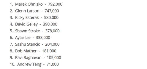 Budete-li v pondělí shánět Marka, stavte se v Arii. Ležet před ním v tu dobu bude fantastických 792.000 v žetonech - tedy téměř čtyřicetinásobek startovního 20tisícového stacku! Vzhledem k formátu turnaje není jasné, kterou úrovní bude druhý den zahájen, včerejší desítka postoupivších se naposledy potýkala s nástrahami levelu 5k/10k/bba10k a před turnajovým lídrem leželo 79 velkých blindů.
