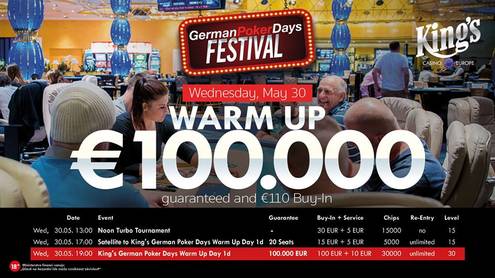 Tak, to bylo - a nyní k tomu, co bude. Již v 17:00 v King's odstartuje satelit s buy-inem €20 a garancí 20 vstupenek do hlavního turnaje. Den 1d pak bude rozehrán v 19:00 a stejně jako během předchozích flightů bude i v jeho průběhu odehráno celkem 15 30minutových úrovní. 30tisícový startovní stack si zájemci v průběhu 13 levelů trvající pozdní registrace mohou vyzvednout také formou neomezených re-entries. Startovní den 1e se od toho dnešního bude lišit ve dvou podstatných detailech - rozehrán bude zítra v 10:00 dopoledne a blindy se v něm budou navyšovat již po 15 minutách.