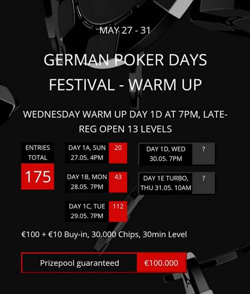 První handy finále budou vyloženy zítra ve 14:30 a pevně věříme, že si do té doby zajistíte místo u turnajových stolů. Kromě zisku podílu z pravděpodobně výrazně dopláceného prizepoolu navíc můžete „obhlédnout terén“ před blížícím se hlavním turnajem German Poker Days. V něm se v termínu od 31. května do 3. června bude při buy-inu €175 soutěžit o podíly z garantovných €200.000, všem českým hráčům přejeme hodně štěstí.