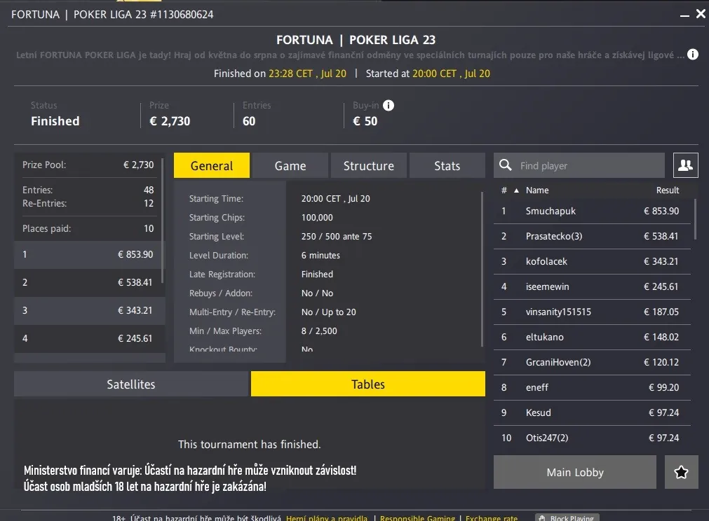 - Mise: FORTUNA POKER LIGA 50 – extra rakeback 12,5 %, získej €50 vstupenku za 9 600 Status bodů