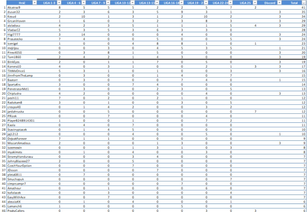 Pořadí TOP 46 Fortuna Poker Ligy ke dni 25. 7. 2025