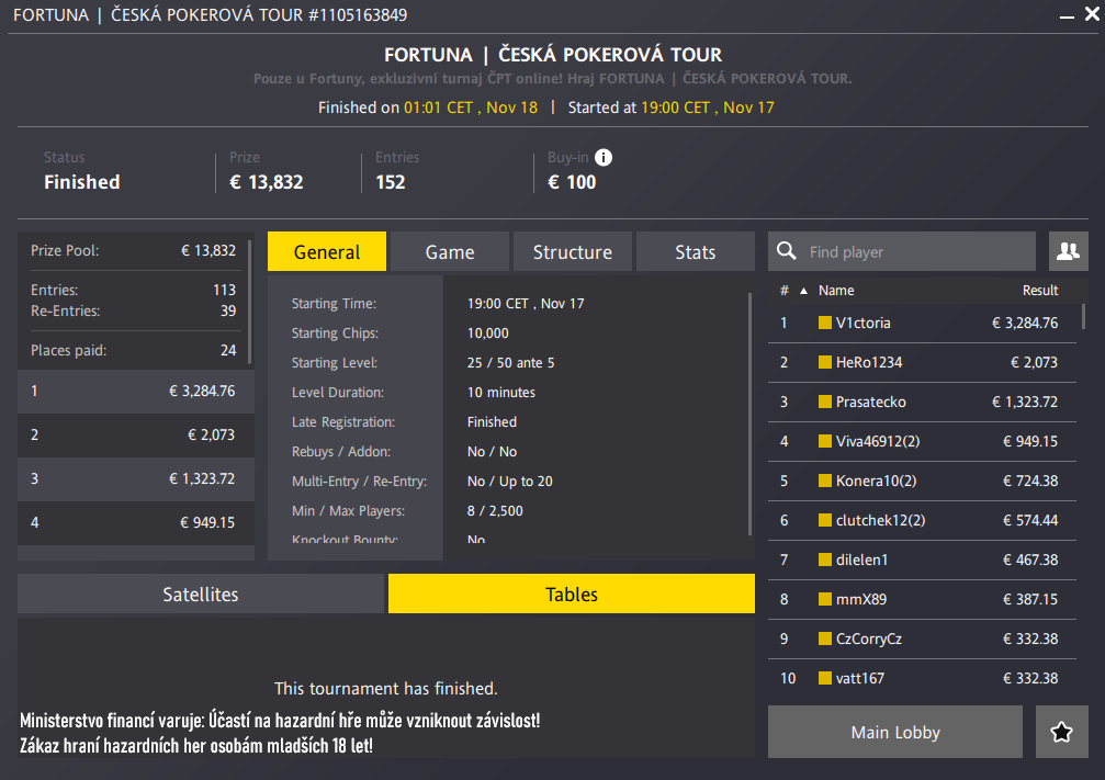 Výsledky turnaje Česká Pokerová Tour Online, Fortuna Poker, 17.11.2024