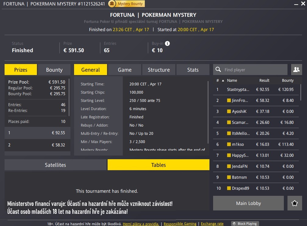 Největší odměnu vydoloval z turnaje český pokerový streamer Luckybird (na Fortuna Pokeru hrající pod přezdívkou Stastnyptacek). Lucky si došel nejen pro první místo ohodnocené na €106, ale také pro největší porci bounties v hodnotě €121. Nejtučnější obálka s bounty €100 v jeho sbírce ale chyběla – ještě než ji stačil sezobnout, rozbalil si ji hráč m1kso.