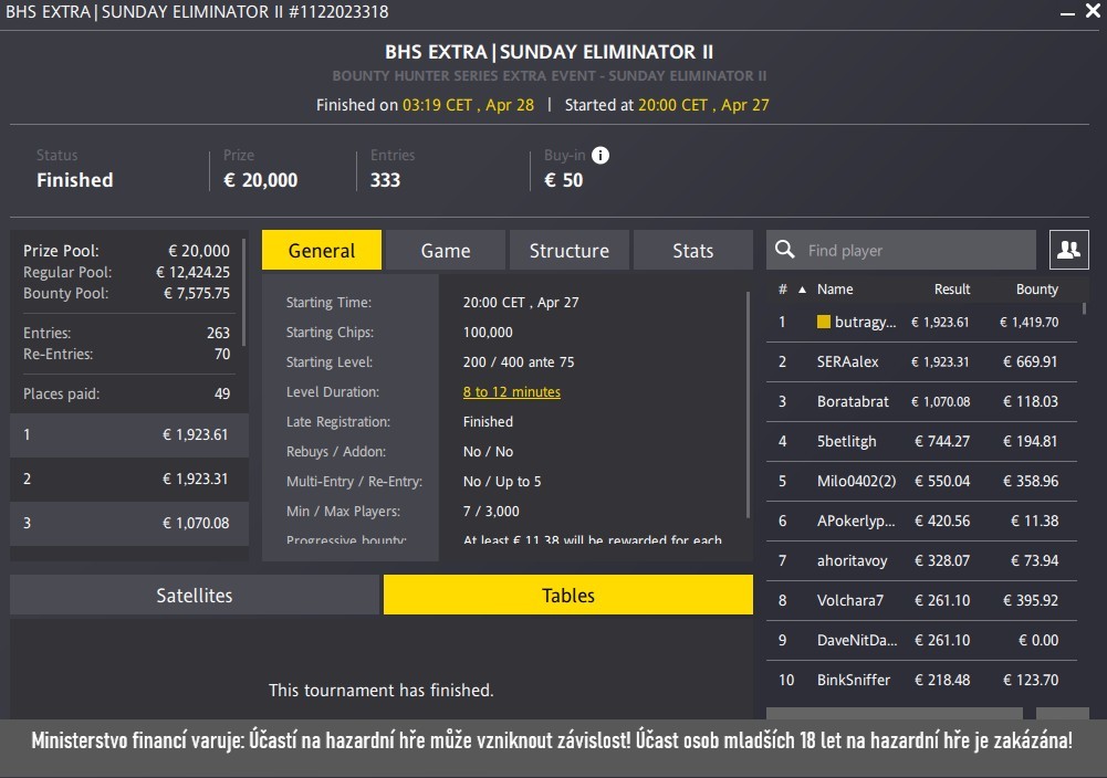 Zařídil ho hráč Butragy2, který si poradil se všemi 262 protivníky v nedělním turnaji BHS Extra | Sunday Eliminator s GTD €20 000 a buy-inem €50. Za skvělý výkon si připsal výhru v celkové hodnotě €3 343.