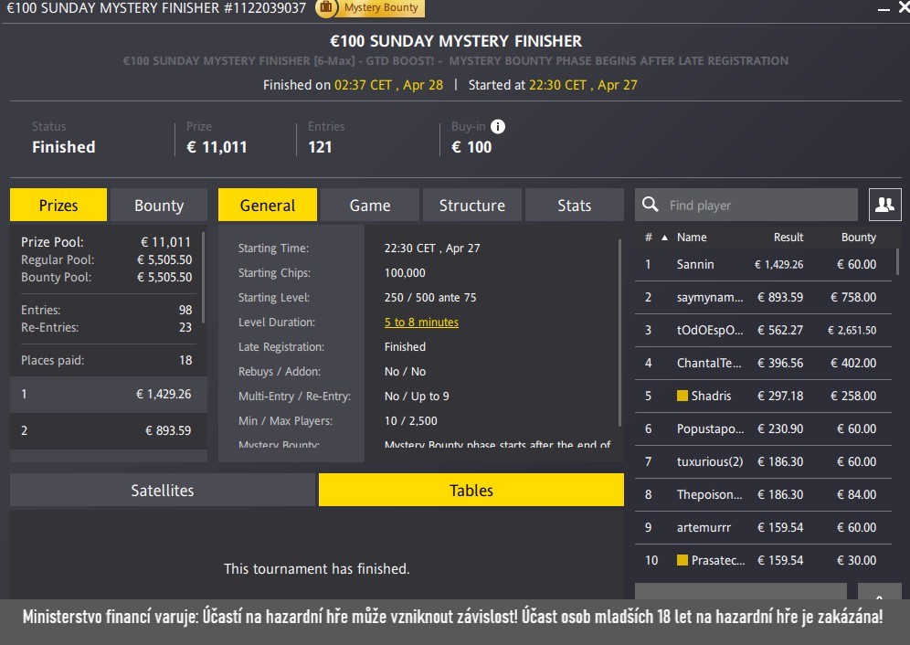 Následně zlepšil svůj výkon o jednu příčku v turnaji Sunday Mystery Finisher se vstupným €100 a GTD €11 011 a přidal další menší výhru v hodnotě €555. Další trefy českých hráčů najdete v článku níže.