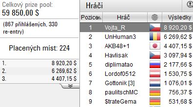 Dvojice českých vytrvalců, která se sešla u finálového stolu, žádná doping nepotřebovala a jakmile se jednou rozeběhla, už ji nešlo zastavit. Mezi nejlepší devítku se rovnou s prvním životem probojovali Vojtěch „Vojta_R“ Růžička a Jiří „Havlisak“ Havlena, letité stálice naší online (a především ve Vojtově případě také živé) scény.