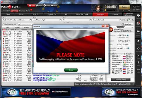 Nyní už víme, že herna v plánovaném termínu své služby pod platnou licencí nabízet nezačne. Po přihlášení do jejího klienta hráče v průběhu dneška přivítalo sdělení s mrazivým poselstvím - PokerStars na území České republiky dočasně pozastavuje hry o reálné peníze, a to od 1. ledna 2017.