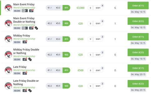 V lobby Fanteamu jsou k dispozici také turnaje Midday Friday (pro zápasy od 16:15) a Late Friday (zápasy od 20:15), stejně jako příslušné Double or Nothing turnaje, které jsou dobrou cestou, jak budovat váš bankroll.