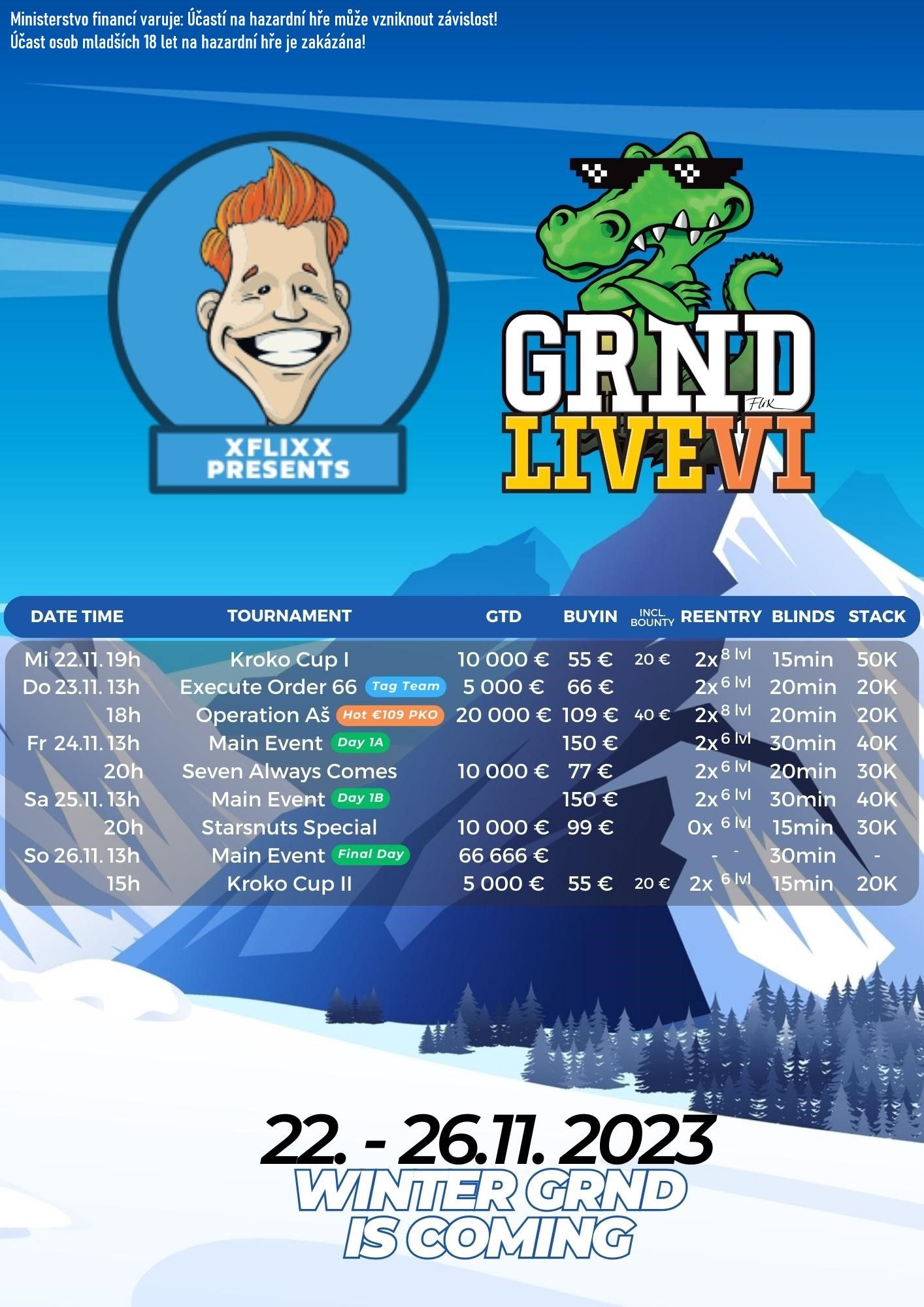 Další velkou akcí v Grand Casinu Aš u Mariánských Lázní bude šestý ročník stejnojmenného německého vzdělávacího webu GRND Live. Od 22. do 26. listopadu bude garantováno celkem €126.000, přičemž hlavní turnaj garantuje při vkladu €150 celkem €66.666. Ve vedlejších turnajích se hráči mohou těšit na fantasticky nízké buy-iny a zajímavé poměry garancí.