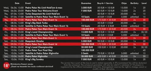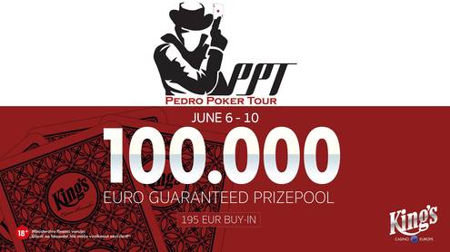 €175 + €20 Main Event Pedro Poker Tour, který v King's proběhne v termínu od 7. do 10. června, je obdařen garancí ve výši €100.000. Cesta do finálového dne vede skrze některý z celkem čtyř startovních flightů, v jejichž průběhu se budou blindy navyšovat po 30 minutách. Startovní stack obsahuje 40.000 v žetonech, povolena jsou dvě re-entries - a to vždy po dobu 13 levelů trvající pozdní registrace.