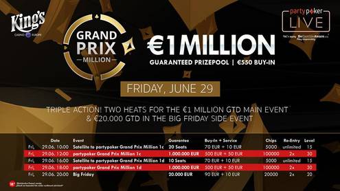 Překlenovací turnaj je minulostí, nyní se naše pozornost přesouvá k největšímu turnaji začátku letní sezóny. Event s názvem partypoker Grand Prix Million hostí King's vůbec poprvé, svými herními parametry se však tento turnaj nijak neliší od dobře zažitých klasických Grand Prix.