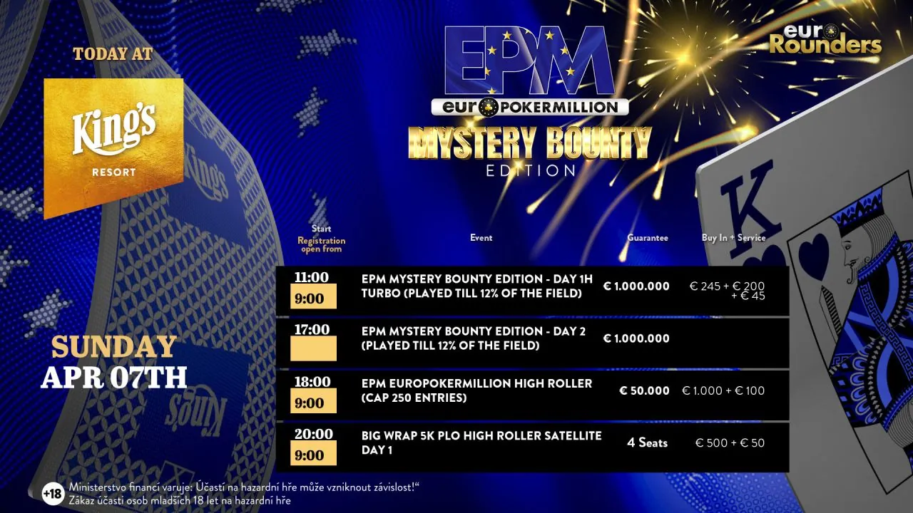 0Euro Poker Million Mystery Bounty Edition s garancí €1.000.000 v King’s Resortu Rozvadově se dnes připravuje na druhý hrací den, do kterého postouplo minimálně 18 českých hráčů. Nejlépe za našich mají turnaj rozehraný David Eiselt a Tomáš "Panda" Brokl.