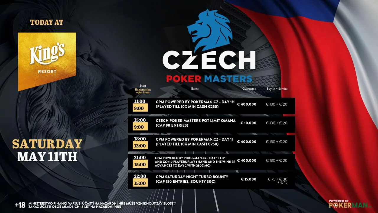 Main Event Czech Poker Masters pokračuje v King’s Resortu Rozvadov už dnes (v sobotu) od 11:00 dnem 1H a v 18:00 začíná den 1I s buy-inem €130 + €20. Krom toho si dnes můžete zahrát side event v Pot Limit Omaze s buy-inem €130+€20 a garancí €10.000, nebo večerní Turbo bounty s buy-inem €75+€30+€15 a garancí €15.000.