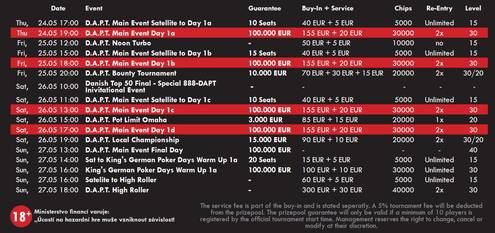 O velmi zajímavé odměny se bude soutěžit také v doprovodných turnajích. Čtvrteční €115 D.A.P.T. Bounty Tournament láká na €10tisícovou garanci, zaručených €15.000 se bude rozdělovat během ITM fáze sobotního €100 D.A.P.T. Local Championship. Celý festival bude zakončen €330 D.A.P.T. High Rollerem, jehož první handy budou rozdány v neděli v 18:00. Také High Roller se může pyšnit vlastním satelitem, buy-in do něj je nastaven na €65. V neděli bude předehrán také úvodní flight turnaje, který spadá pod křídla dalšího velkého festivalu. €110 German Poker Days Warm-up bude v King's probíhat v termínu od 27. do 31. května a také on slibuje mezi své nejúspěšnější účastníky rozdělit minimálně €100.000, první z pěti startovních flightů je na programu v neděli 27. 5. od 16:00.