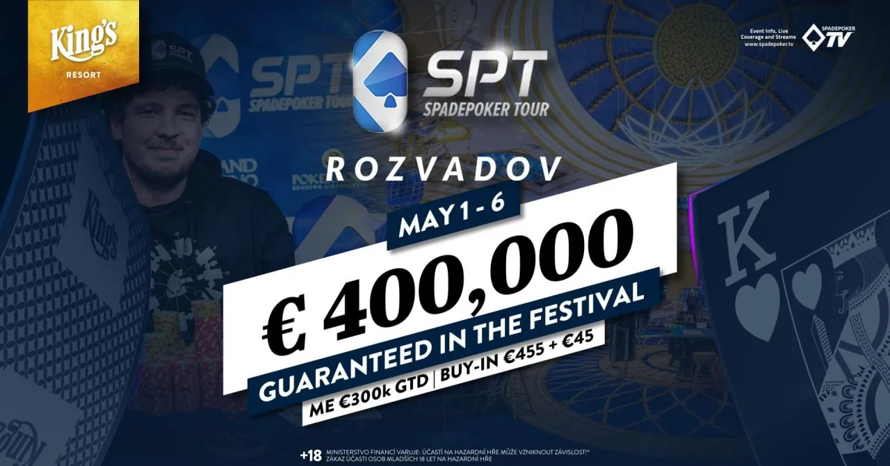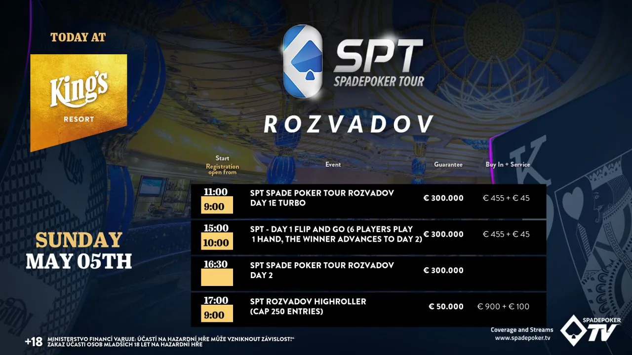 Main Event Spade Poker Tour pokračuje v King’s Resortu Rozvadov už dnes od 11:00 posledním flightem 1E a od 16:30 se pak rozehraje druhý hrací den.