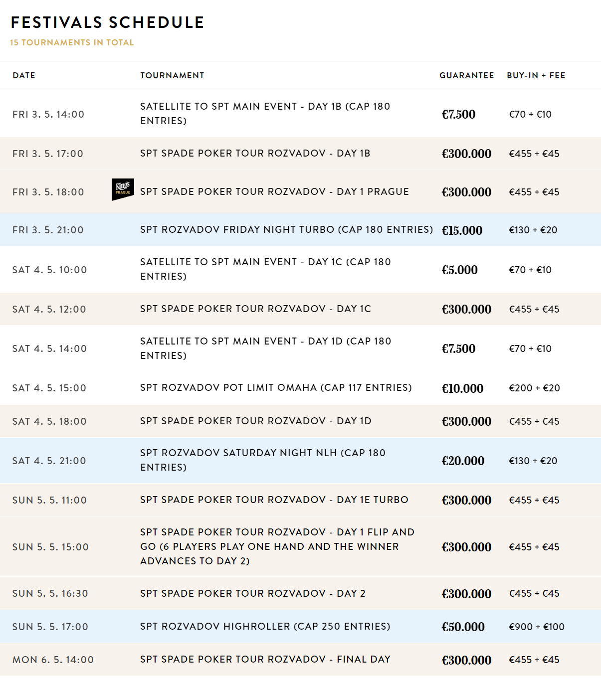 Pokud nemáte o víkendu tolik času, přijde vám vhod nedělní Day E v podobě turba od 11:00 nebo ještě rychlejší Day 1 Flip and Go, ve kterém se hraje jediná handa a vítěz postupuje rovnou do druhého dne turnaje. Od 17:00 se pak rozehraje High Roller s buy-inem €900+€100 a garancí €50.000. Mrkněte na celý rozpis včetně dalších turnajů s nižším buy-inem: