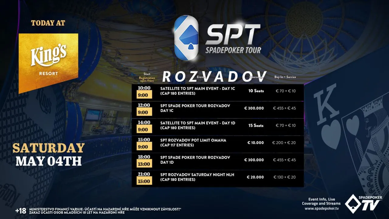 Main Event Spade Poker Tour pokračuje v King’s Resortu Rozvadov už dnes (v sobotu) od 12:00 dnem 1C a v 18:00 začíná den 1D s buy-inem €455 + €45. Do nich se můžete dostat i levněji ze satelitů za €70 + €10, které startují v 10:00 a ve 14:00.
