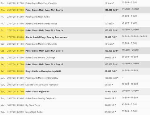 Hlavní turnaj nadcházejícího Poker Giants Festival se uskuteční v termínu od 26. do 29. července a nabídne čtveřici startovních flightů. Ten první je na programu ve čtvrtek od 19:00 hodin, druhý naváže o den později v 18:00 a na sobotu je připravena tradiční dvojnásobná porce startovních dnů, a to se začátkem ve 13:00 respektive 17:00 hodin.