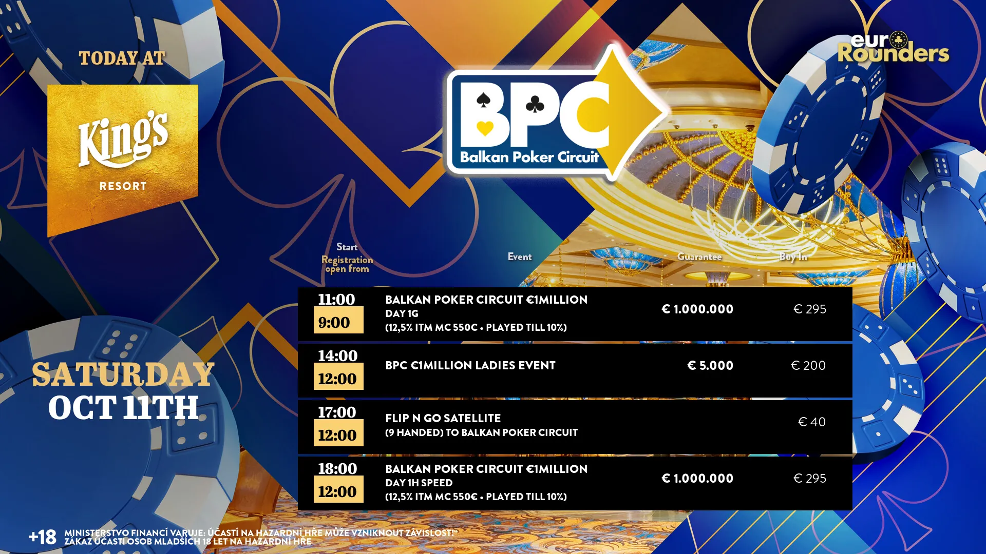 0Páteční flighty turnaje Balkan Poker Circuit €1 000 000 GTD zaplnily pokerové stoly King’s Casina Rozvadov. Mezi stovkami zúčastněných hráčů se našlo i několik reprezentantů českého pokeru, kteří si zabalili stacky do dalších dnů. Pojďte s námi zjistit, jak vysoké stacky drží.
