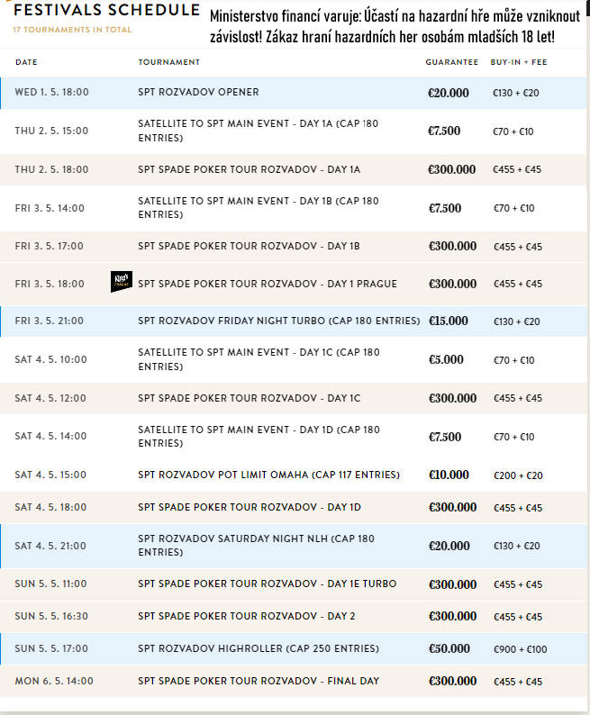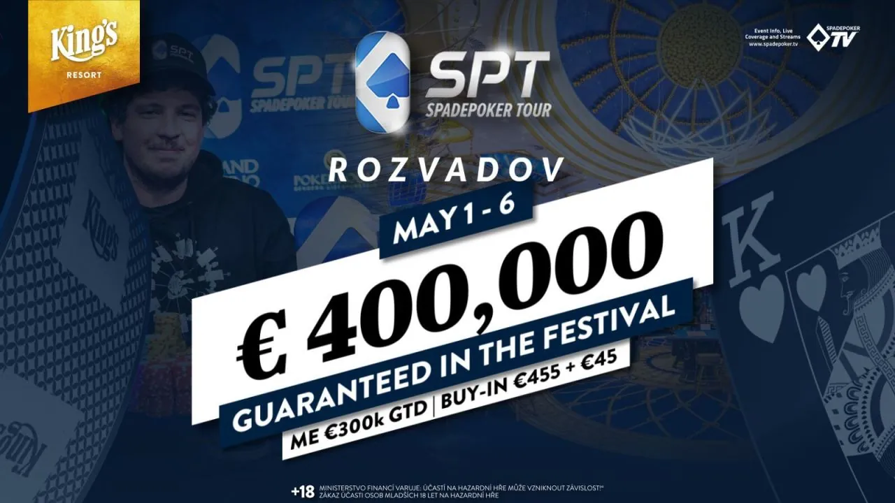 0Od 1. května je v King’s casino Rozvadov na programu festival SPT Spade Poker Tour s celkovou garancí €400.000. Od středy do neděle nás čeká Main Event o €300.000 se spoustou flightů, klasické jednodenní poker turnaje, High Roller a Omaha. Tak který turnaj si vyberete vy?