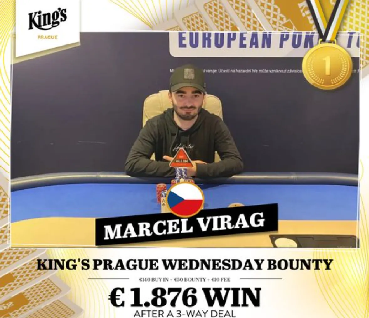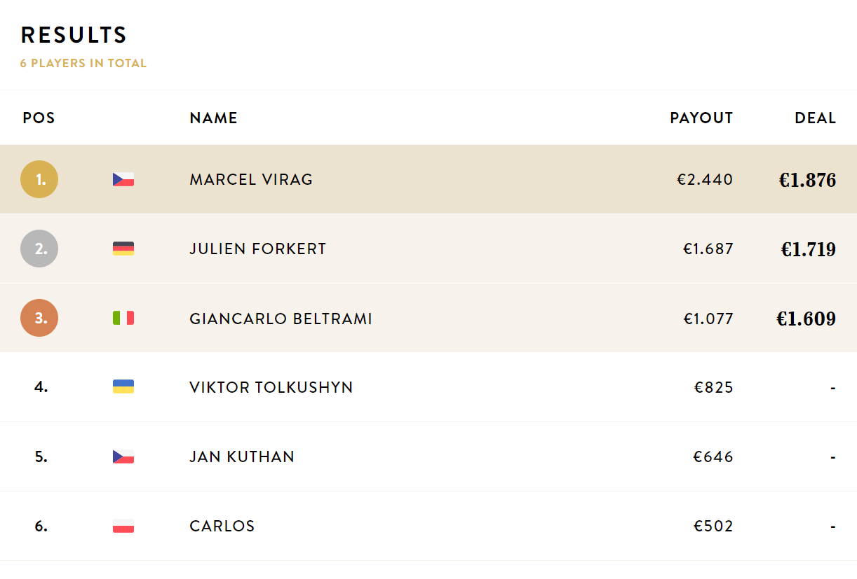 Na finalu tak české barvy hájil už jen Marcel Virag, ale o to úspěšněji. V ukrajinské, italské a německé společnosti si dokráčel pro vítězství. Po 3-way dealu k získaným odměnám za bounty přidal ještě €1.876 a zakončil tak úspěšný večer pro hráče s českou vlaječkou u jména.