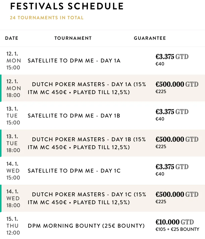 Čtyři satelity za €40 a jedenáct flightů za €226 směřuje k jednomu cíli. Dovést ty nejlepší přes DAY2 do pondělního finále Main Eventu, kde se bude hrát o garanci €500.000. Kvalifikace začíná hned v pondělí a v rámci flightů můžeš volit klasiku, turbo nebo flip and go. Na programu bude také jeden pražský turnaj.