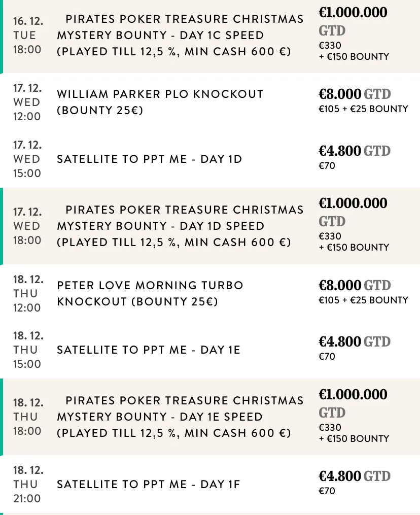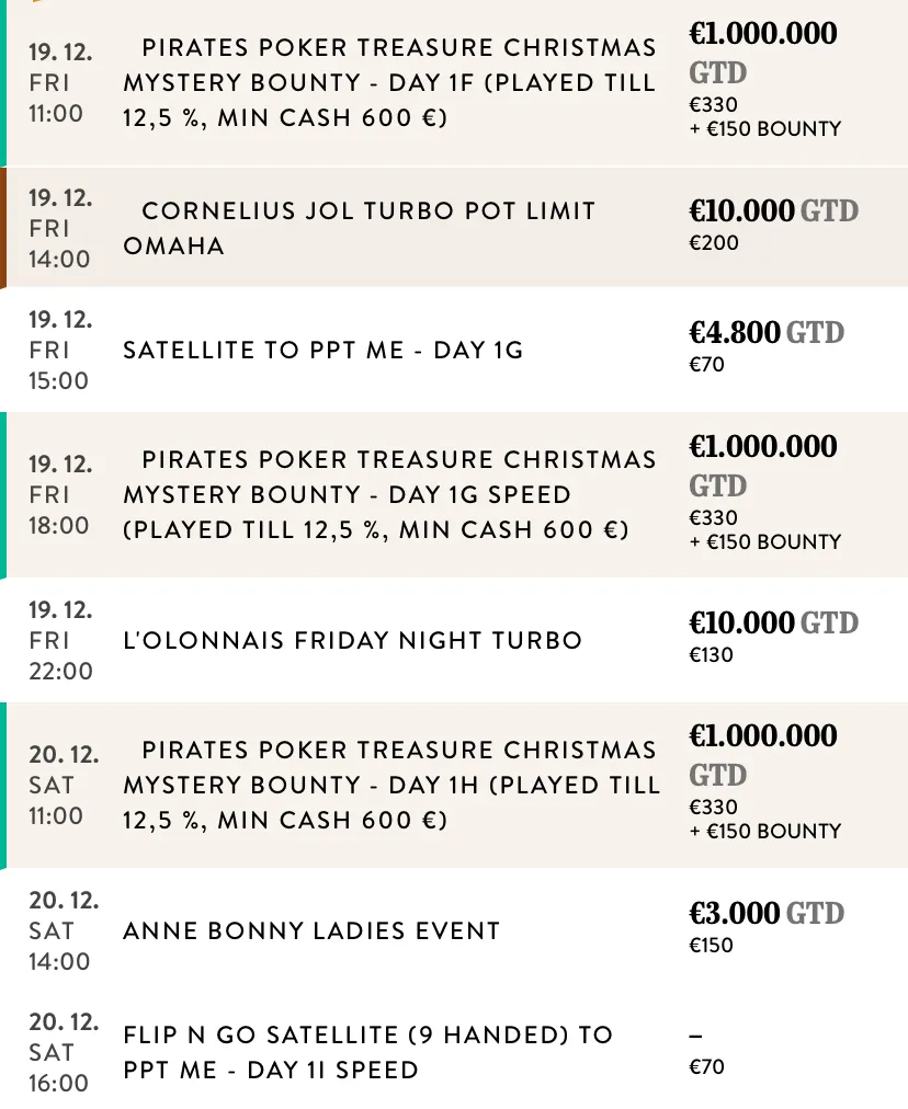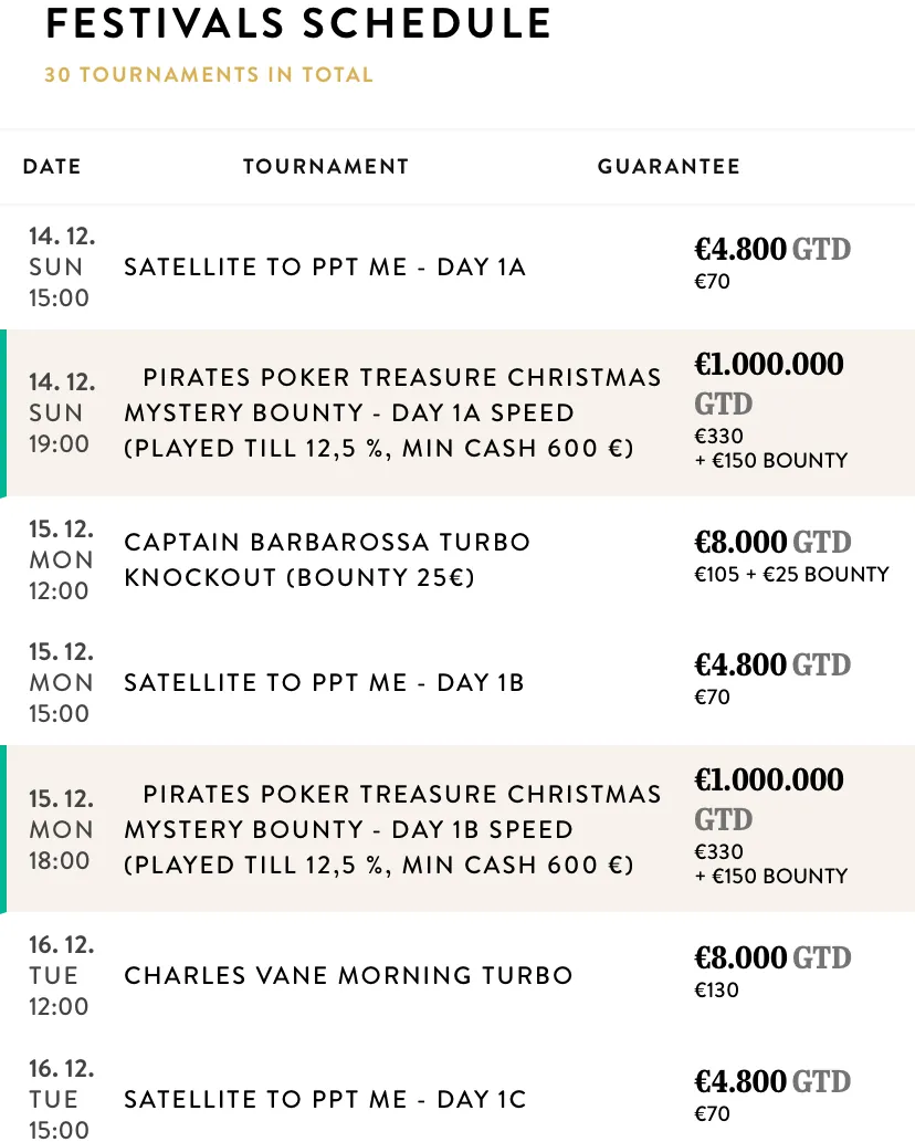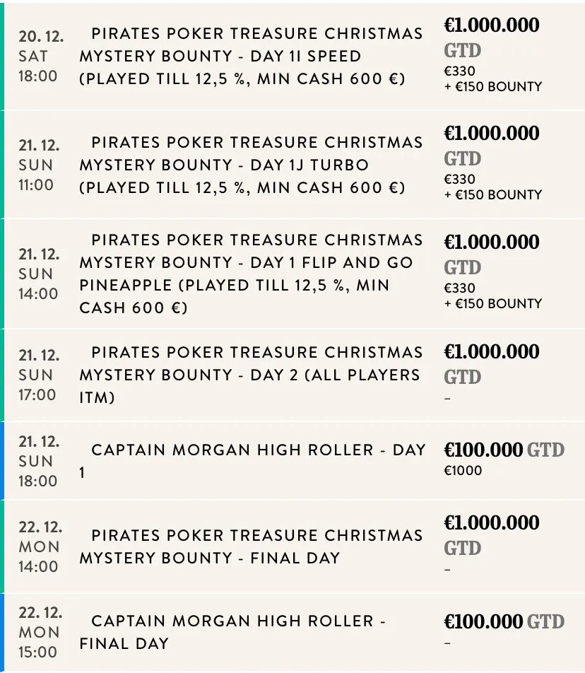 0Největší Mystery Bounty je zpět! Série Pirates´ Poker Treasures Christmas Edition právě zakotvila na Rozvadově. V truhle hlavního eventu je garance €1.000.000. Co dalšího piráti chystají a jaká kořist bude ještě k mání?