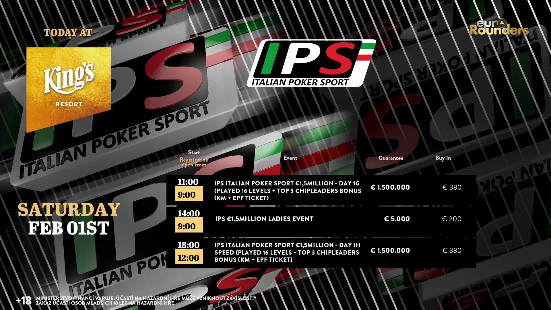 0Pořádný nával italských hráčů včera zaznamenali na festivalu Italian Poker Sport €2.000.000 GTD v King’s Resortu v Rozvadově. Více než 2.000 resitrací bylo zaznamenáno ve včerejších turnajích a naši borci se rozhodně neztratili. Tomáš Knespl obsadil třetí místo v poker turnaji NLH Turbo Bounty a v Main Eventu postoupilo sedm českých reprezentantů.