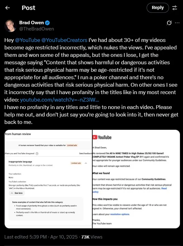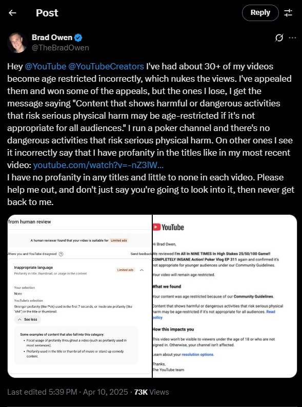 Již v dubnu 2025 postnul Brad Owen (na YouTube více než 750 000 odběratelů) na síť X informace o tom, že u více než 30 z jeho videí došlo k nesprávnému nastavení věkového omezení, což výrazně snížilo jejich sledovanost. Brad podal odvolání a některá z nich byla uznána, ale u těch zamítnutých se zobrazily zprávy, které nijak nesouvisely s pokerem – například že obsah ukazuje riskantní činnosti, které mohou vést ke zraněním a podobně.