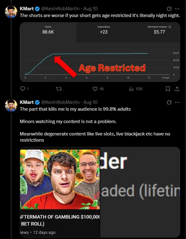 Desátého srpna postnul na síti X další zprávu týkající se tohoto tématu Kevin (Kmart) Martin. Tvůrce obsahu s více než 150 000 odběrateli, jenž nás zásobuje kvalitní tvorbou více než 10 let, napsal, že je poker kontent na YouTube odepsaný.