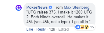 První handa dne, esa do králů - a dvououtový konec v turnaji. Nabízí se myšlenka, zda se v podobné situaci nedají esa naprosto výjimečně zahodit; méně variančních spotů nabízí Main Event každému svému účastníkovi dostatek. Toť otázka do diskuze, my se rozloučíme konstatováním, že Steinberg se letošním světovým šampionem jistojistě nestane. Stále se ale nabízí tisíce dalších adeptů a mnozí z nich, včetně těch českých, se představí v dnešním dni 1c. Ten bude opět zahájen úderem dopolední jedenácté hodiny lasvegakého času, všem českým hráčům přejeme hodně štěstí.