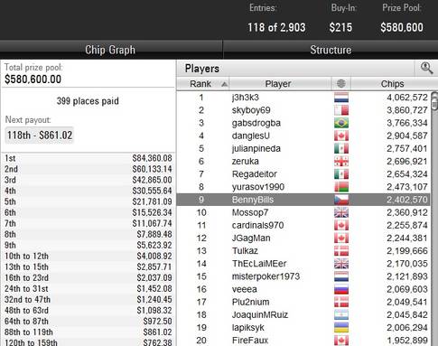 Na titul může stále ještě dosáhnout také český hráč skrývající se pod přezdívkou BennyBills, jemuž se během včerejška dařilo náramně a díky zisku 2.402.570 v žetonech/96 BB se zařadil na devátou příčku průběžného pořadí. Jinak to ale byla nuda, nuda, šeď, šeď...