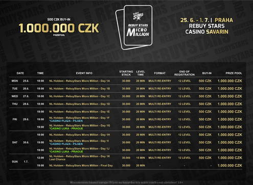 Od pondělí 25. června do neděle 1. července najdete v prostorách barokního paláce Savarin nadupaný speciál Micro Million s celkovými odměnami ve výši 1.000.000 korun! Do turnaje se přitom dostanete doslova za pár stovek, buy-in dělá pouhých 500 korun. Celkem proběhne 11 startovních flightů. Kromě startovních dnů v Rebuy Stars Casinu Savarin můžete využít i dva startovní flighty v Plzni a na pražských Lukách a to v termínu 29. června a 30. června. V turnajovém programu nechybí ani oblíbená Last Chance, v neděli 1. července.