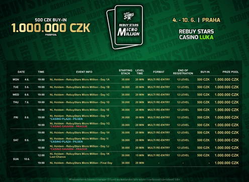 Dnes bude Micro Million pokračovat v hned třech pobočkách Rebuy Stars, kromě pražských Luk a Savarinu navštíví také plzeňskou Plazu. Parametry všech flightů jsou totožné: startovní stack obsahuje 30.000 v žetonech, levely trvají 20 minut a pozdní registrace, v jejímž průběhu je možno využít neomezeného počtu re-entry, je otevřena během úvodních 12 úrovní. Úplně stejně vypadá také sobotní program, flighty v Plaze a na Lukách budou rozehrány vždy v 19:00 a ty v Savarinu o hodinu dříve. Poslední šanci, jak si urvat podíl z tučného prizepoolu, nabídne nedělní last chance flight 1k. Ten bude na Lukách zahájen úderem pravého poledne, blindy se budou navyšovat již po 15 minutách. Finále s 20minutovými levely pak v Rebuy Stars Luka odstartuje v neděli v 19:00. Ať už jistým či budoucím, všem jeho účastníkům přejeme hodně štěstí.