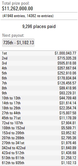 Každý z postoupivších hráčů má zajištěnu odměnu ve výši $1.102, účast na finálovém stole má hodnotu $63.229 a pro vítěze turnaje je připraveno $1.000.044.