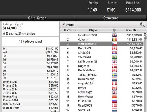Až v půl desáté dopoledne měl tentokrát hotovo Vojtěch „LlKE A G6" Červinka, za což mohla jeho účast v heads-upu $109 Sunday Wrap-Up, $25k GTD. Také v něm došlo k dealu, v němž si náš hráč dohodl na výhře $5.837, tedy ještě o pár stovek vyšší než jeho (rovněž brazilský) protivník.